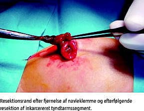 Summary The umbilical cord of newborn babies should be clamped at least five centimetres from the abdominal wall Ugeskr Læger 2011;173(37):2270-2271 A three day-old boy was brought to a department of paediatric surgery with mechanical ileus under suspicion of morbus Hirschsprung. Early into surgery it was found that the cause of ileus was an iatrogenic clamping of a small unrecognized omphalocele. In view of recent literature there is not found any evidence of advantage of near skin clamping of the umbilical cord. It is therefore recommended that the clamping of the umbilical cord is done at least five centimetres from the abdominal wall. If the umbilical cord is broad-based it is also recommended to clamp at a safe distance from the basis.