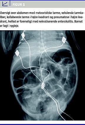 Fem uger gammel blev barnet ustabilt og havde grøngullige aspirater, distenderet ømt abdomen, sparsomme tarmlyde og blodige afføringer. En OOA gav mistanke om NEC med pneumatose, kalibervekslen og muligvis kollaberede tarme i højre side, der var ingen luft i rectum og ingen fri luft (Figur 1 ). Laktat var 1,4 mmol/l. Man pauserede igen med mad og påbegyndte behandling med cefuroxim, gentamicin og metronidazol samt parenteral ernæring. Barnet blev intuberet og overflyttet til en højt specialiseret enhed med henblik på operation for NEC.