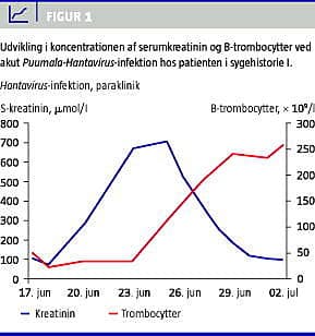 I. En 46-årig sjællandsk kvinde blev indlagt akut på en medicinsk afdeling med fire dages anamnese med høj feber, kvalme og hovedpine. Ved indlæggelsen var der normalt serumkreatininkoncentration, men lavt B-trombocyt-koncentration. Udvikling af S-kreatinin- og B-trombocytkoncentration over de næste 14 dag fremgår af Figur 1 . Højeste S-kreatininkoncentration sås på dag 8, herefter var der et spontant fald og polyuri. Der blev foretaget måling af hæmaturi og proteinuri med urinstiks.