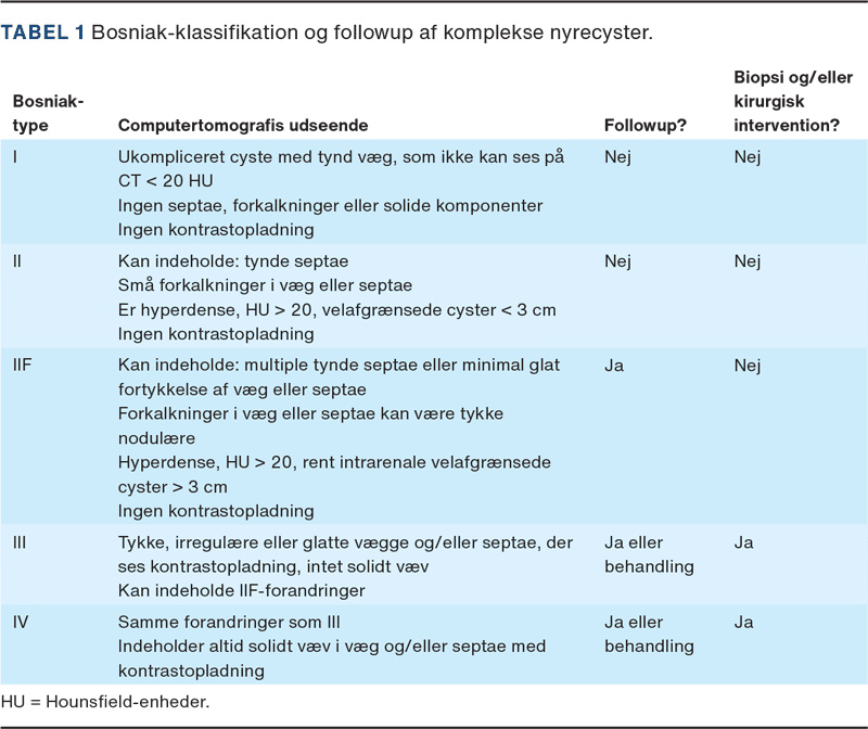 Nyrecyster er det hyppigste fund ved billeddiagnostiske undersøgelser og ses ved ca. 40% alle undersøgelser. De fleste cyster er godartede og asymptomatiske. De menes at være til stede i op til 5% af den generelle befolkning, og prævalens stiger til ≥ 27% hos personer > 50 år [5]. Nyrecyster opdages ofte ved en UL-undersøgelse, og hvis de beskrives som simple cyster, er der ikke indikation for yderligere udredning eller kontrol. Hvis de beskrives som komplekse cyster, anbefales en udredning med en CT med kontrast, idet risikoen for malignitet kan vurderes ved at anvende Bosniak-klassifikationen, der senest er opdateret i 2019 (Tabel 1). Bosniak I- og II-cyster er simple og godartede, og der er således ikke indikation for yderligere udredning eller kontrol. Bosniak IIF-cyster kan have et malignt potentiale og bør kontrolleres med ny flerfaset CT efter et, tre og seks år [5]. Risikoen for malignitet ved Bosniak III- og IV-cyster er hhv. ca. 51% og 90% [5]. Aktiv overvågning af Bosniak III-cyster anbefales som et alternativ til primær kirurgi, da kun ca. 51% af læsionerne er maligne med et lavt malignt potentiale [6]. Ved kontrastopladning og ønske om behandling ved Bosniak III og IV anbefales biopsi forud for behandling. Der kan tilbydes behandling (resektion eller ablation) af Bosniak III- og IV-cyster på grund af deres risiko for malignitet [6].