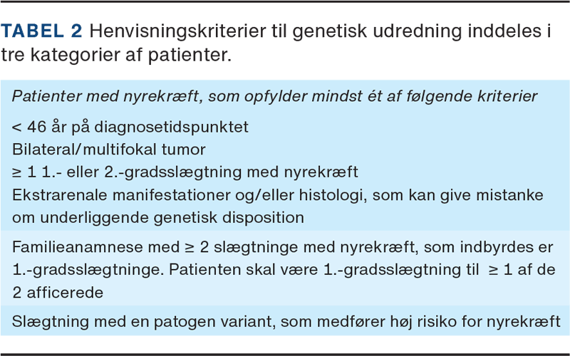 De fleste tilfælde af nyrekræft er sporadiske, men det estimeres, at ca. 5-10% af nyrekræfttilfældene skyldes monogen disposition [14, 15]. Der er i dag beskrevet flere forskellige prædispositionssyndromer, hvor risikoen for nyrekræft/nyretumorer er øget. Ved monogen disposition er arvegangen oftest autosomal dominant med nedsat penetrans. Man vil ikke nødvendigvis se en familieanamnese med afficerede i flere generationer; hvilket kan forklares både ved den nedsatte penetrans, og ved at der kan være tale om nymutationer. Mosaicisme for en patogen variant er beskrevet hos patienter med f.eks. von Hippel-Lindaus (vHL) syndrom og Cowdens syndrom [15, 16]. Ved arvelig disposition udvikles nyrekræft oftest i en tidligere alder, og der ses oftere bilaterale og/eller multiple tumorer. Derudover kan andre symptomer/fænotypiske træk give mistanke om en bagvedliggende monogen disposition, f.eks. hæmangioblastom ved vHL syndrom, stort hovedomfang ved Cowdens syndrom eller spontan pneumothorax ved Birt-Hogg-Dubés (BHD) syndrom. Kriterier for henvisning til genetisk udredning ses i Tabel 2 [15].
