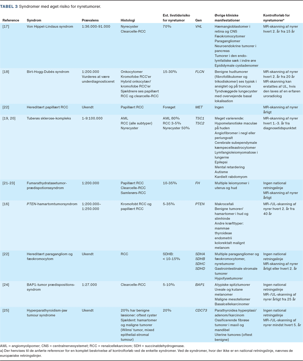I det følgende gennemgås kort nogle af de beskrevne nyretumorprædispositionssyndromer. I Tabel 3 præsenteres yderligere nogle mere sjældne syndromer.