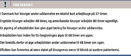Kvaliteten af den kirurgiske uddannelse har betydning for kvaliteten af patientbehandlingen. Optimering af kirurgisk uddannelse har ofte været diskuteret [1-4], dog uden kendskab til den optimale arbejdsuges længde. Den relativt korte arbejdsuge kan være problematisk for kirurger under uddannelse, da de skal tilegne sig praktiske tekniske færdigheder ud over medicinsk viden og klinisk erfaring [5]. Der er store forskelle på arbejdstiden i Danmark, USA og England for kirurger under uddannelse [5]. I England er arbejdsugen på 48 timer, og i USA er den på 80 timer. Desuden er der forskel på antallet af ferieuger: fra to ugers ferie i nogle stater i USA, til fem (seks) ugers ferie i Danmark [5, 6]. På trods af forskelle i arbejdstid tager det i alle tre lande 5-6 år at uddanne en kirurg.