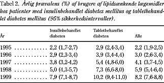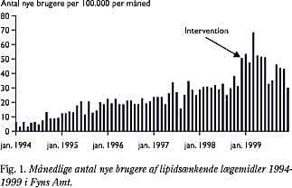 Resultater: Forbruget af lipidsænkende lægemidler steg signifikant efter interventionen. Incidensrateratio (efter/før) var 1,43 (SI: 1,35-1,52). Før interventionen var der en gennemsnitlig årlig stigning i prævalensen af brugere af lipidsænkende lægemidler på 0,2%, efter interventionen steg prævalensen med 0,4%. For patienter med insulinbehandlet eller peroralt behandlet diabetes mellitus var de tilsvarende tal 1,2% og 2,3% og for patienter med kendt iskæmisk hjertesygdom 5,0% og 8,1%.