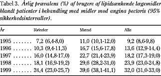 Tabel 1 viser den årlige prævalens af LSL-brugere fra 1995 til 1999 for mænd og kvinder fordelt på alder. I årene før interventionen steg prævalensen af LSL-brugere i gennemsnit 0,2% per år (0,0 - 0,3%); i året efter interventionen steg prævalensen med 0,4 %. Tabel 2 viser den årlige prævalens af LSL-brugere blandt insulin- og tabletbehandlede diabetikere. Før interventionen steg prævalensen af LSL-brugere med i gennemsnit 1,2% (0,2 - 2,2%) per år; i året efter interventionen steg prævalensen med 2,3%. Tabel 3 viser den årlige prævalens af LSL-brugere blandt patienter i behandling med lægemidler mod angina pectoris. Den gennemsnitlige stigning i årsprævalensen af LSL brugere før interventionen var 5,0% (3,4 - 6,5%) per år; efter interventionen steg prævalensen med 8,1%. I året efter interventionen var 32% af patienter, som tog midler mod angina pectoris, i behandling med LSL.