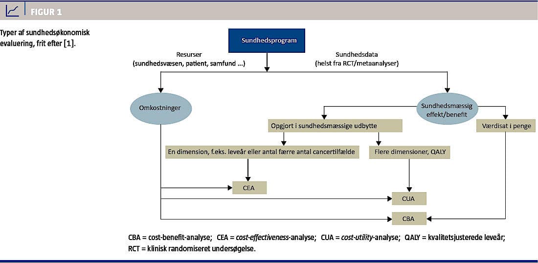 Målet for opgørelsen af det sundhedsmæssige udbytte af en behandling afgør, hvilken type af sundhedsøkonomisk analyse der kan gennemføres. Der findes grundlæggende to hovedformer: Cost-benefit-analyser (CBA), og cost-effectiveness-analyser (CEA), hvor den sidste også omfatter cost-utility-analyser (CUA) (Figur 1).