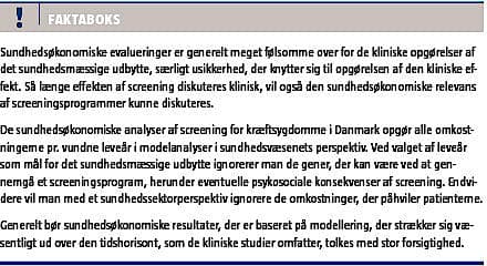 leveår på ca. 100.000 kr. [2-4], hvilket normalt betragtes som omkostningseffektivt. På trods af omkostningseffektratioen har der for alle screeningsprogrammerne løbende været rejst kritik om, hvorvidt screening er en fornuftig brug af sundhedsbudgettet. Indvendingerne har været koncentreret om tre hovedpointer [5-7]: 1) screeningens betydning for dødeligheden, 2) screeningen medfører unødvendige indgreb, og 3) screeningen påvirker det psykosociale helbred.