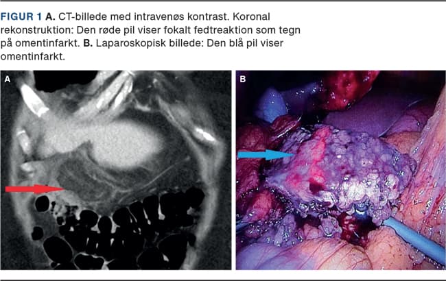 På mistanke om kolecystitis blev der foretaget UL-skanning af øvre abdomen, uden at man kunne påvise patologi, hvorfor der blev foretaget CT af abdomen med intravenøs kontrast i portovenøs fase otte timer efter UL-skanningen. I øvre højre kvadrant, i relation til ligamentum falciforme, fandt man et 6 x 3 cm stort fokalt område med fedtreaktion uden veldefineret hyperdens ring og med lidt fri væske omkring, hvilket er foreneligt med OI. Der var radiologisk mistanke om intern herniering af mesenterialt fedtvæv og torkvering pga. såkaldt whirl sign (Figur 1A). Patienten blev indlagt til observation.Pga. klinisk forværring og CT-verificeret omenttorkvering blev der foretaget laparaskopi. Peroperativt fandtes i ligamentum gastrocolicum mellem antrum og højre colon fleksur svært fortykket og hårdt nekrotisk oment, som blev fjernet laparoskopisk (Figur 1B).