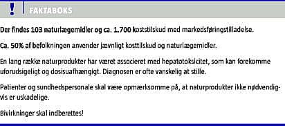 Brugen af naturlægemidler og kosttilskud er omfattende og stigende, og der er både i Danmark og internationalt rapporteret om flere tilfælde af alvorlige hepatotoksiske bivirkninger. Der kan ses et bredt spek-trum af kliniske manifestationer, og leverpåvirkning forekommer oftest uforudsigeligt og dosisuafhængigt, hvilket gør, at diagnosen kan være svær at stille. Befolkningen bør oplyses om, at naturprodukter ikke nødvendigvis er uskadelige, og det er vigtigt, at mistanke om bivirkninger, herunder interaktioner, indberettes til Fødevarestyrelsen/Lægemiddelstyrelsen.