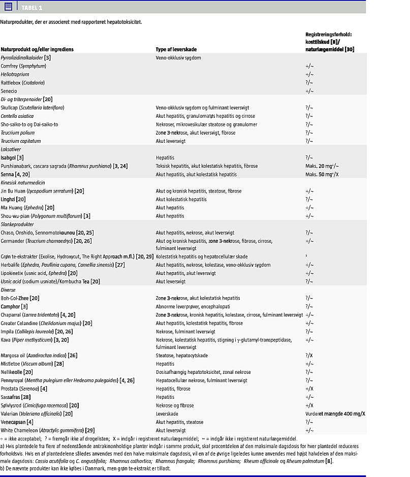 Tabel 1 viser naturprodukter, der er associeret med hepatotoksicitet, typen af leverskade og produktets registreringsforhold i Danmark. Nogle af produkterne har kun været sat i forbindelse med et enkelt tilfælde af leverpåvirkning, andre med multiple. Listen er ikke udtømmende.