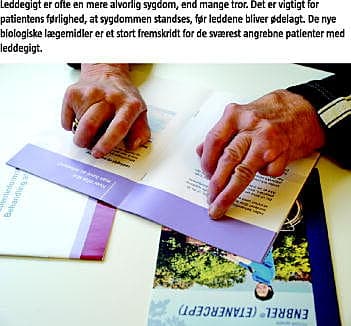 Interessekonflikter: Undersøgelsen er gennemført af COWI med finansiering af Wyeth Danmark A/S. Claus Rasmussen har modtaget honorar fra Abbott og Wyeth for undervisning om kommunikation med smertepatienter. Rose-Marie Lindkvist er ansat i Wyeth Danmark A/S, som markedsfører etanercept.