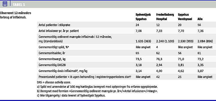 Der er fundet en betydelig variation mellem den gennemsnitligt ordinerede mængde infliximab ved de tre sygehuse. Konfounder- analyse viser, at forbruget ved to af sygehusene kan forklares med DAS28 og varigheden af behandlingsforløbet. Ved disse to sygehuse er den gennemsnitlige dosis pr. kg legemsvægt væsentligt over 3 mg/kg, som er standarddosis. Ved det tredje sygehus er kun patientens vægt en forklarende faktor. Her er den gennemsnitlige dosis tæt på 3 mg/kg. Forskellen kan skyldes, at der ved de to af sygehusene er en større tilbøjelighed til at praktisere dosisøgning, mens det tredje sygehus er mere tilbøjeligt til at skifte til et af de to andre lægemidler, når der opstår behov for dosisøgning. Det vil imidlertid kræve forløbsdata at dokumentere dette. Den multivariate analyse er suppleret med en følsomhedsberegning, hvor de første tre måneder af tidsvinduet udelades. Forskellene mellem de tre sygehuse blev ikke påvirket heraf. Dette udelukker, at variationen skyldes patienter under opstart, som i indkøringsperioden har et højere forbrug.