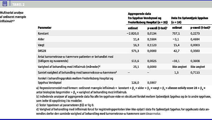 Den gennemsnitlige årlige ordinerede mængde infliximab var 1.635 mg ved Sydvestjysk Sygehus, 2.240 mg ved Frederiksberg Hospital og 2.530 mg ved Sygehus Vendsyssel. I gennemsnit af alle patienter var den ordinerede mængde 2.084 mg, hvilket svarer til en dosering på 3,87 mg/kg (Tabel 1 ). Antallet af behandlinger pr. år varierer fra 7,08 ved Sydvestjysk Sygehus til 7,70 ved Sygehus Vendsyssel. Multivariat analyse af konfoundere viser, at vægten er den eneste variabel med signifikant forklaringsevne i data fra Sydvestjysk Sygehus (Tabel 2 ). I data fra Frederiksberg Hospital og Sygehus Vendsyssel er mønsteret anderledes. Her er der en signifikant indflydelse på variationen i den ordinerede mængde infliximab fra DAS28, varighed af behandling med infliximab samt det samlede antal biologiske lægemidler, som patienten gennem tiden er blevet behandlet med (signifikansniveau 5%).
