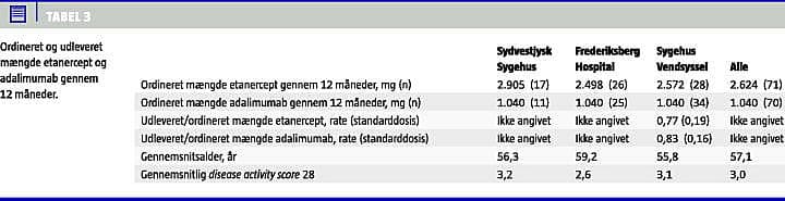 Udleveringsraten af adalimumab og etanercept kunne udelukkende beregnes ved Sygehus Vendsyssel, hvor der beregnedes en udleveringsrate på 77% af den ordinerede mængde etanercept og 83% af den ordinerede mængde ada-limumab (Tabel 3 ). Udleveringsraterne for etanercept og adalimumab er ikke signifikant forskellige (t-test, log-normal fordeling, p > 0,05). Den sammenvejede udleveringsrate på 0,80 er signifikant forskellig fra et med et 95% konfidensinterval på 0,74-0,83. Da dette forekom højt, blev journaler for de seks mest ekstreme cases gennemgået. I fem ud af seks tilfælde kunne forskellen begrundes med patientens sygehistorie, som krævede behandlingspauser. To patienter var opereret, to havde haft infektioner, og en patient var kendt for at tage medicinen uregelmæssigt. I den sjette case var der datafejl, som førte til udelukkelse fra undersøgelsen.