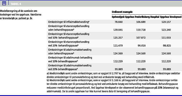 Resultater: Omkostningerne til infliximab varierer som følge af dosisøgning fra 78.660 kr. pr. patientår ved et sygehus til 120.657 kr. ved et andet sygehus. Etanercept og adalimumab vil tendere til at koste det samme eller mindre, når der samtidig forekommer behandlingspause i mindst 10% af tiden, og infliximab doseres over standarddosis (3 mg/kg). Ved et sygehus observeredes behandlingspauser i forbruget af etanercept og adalimumab på 20%.