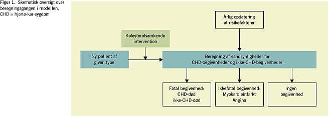 For at en sådan model kan bruges, er det væsentligt, at de sandsynligheder, der styrer patientens vej fra en tilstand til den næste ved hvert periodeskift, de såkaldte overgangssandsynligheder, er så realistiske som muligt. I den foreliggende model er sandsynlighederne for en CHD-begivenhed (fatal såvel som ikkefatal) hentet fra Copenhagen Risk Score [11]. Disse sandsynligheder afhænger af alder og køn, forekomst af diabetes, rygerstatus og kolesterolniveau og derfor opdateres de efter hver periode, idet den hypotetiske patients alder ændres i hvert af modellens beregningstrin. Der benyttes forskellige funktionssammenhænge (risikoligninger) til beskrivelse af risikoen for CHD betinget af alder, køn osv., afhængigt af om patienten tidligere har været udsat for en CHD-begivenhed eller ej. En simplificeret oversigt over det typiske beregningstrin i modellen er givet i Figur 1 .