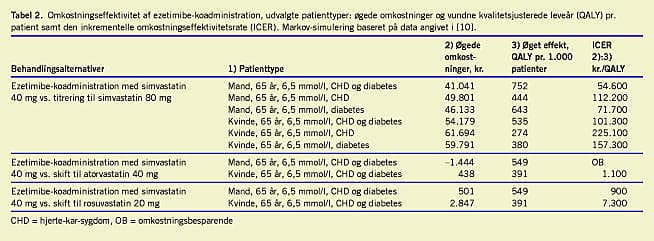 Resultater: Ezetimibe-koadministration vil vurderet over hele livsforløbet være noget dyrere end simvastatintitrering, men det skal ses i relation til den forbedrede overlevelse og forøgede livskvalitet. For typiske patienter vil behandlingen være forbundet med en omkostning på 50.000-100.000 kr. pr. vundet leveår, hvilket ikke kan anses for dyrt set i relation til andre interventioner, som vælges i sundhedsvæsenet. For visse patienttyper, der er i behandling med potent statin (atorvastatin), vil der endda kunne spares omkostninger, samtidig med at livsforventning og livskvalitet øges.