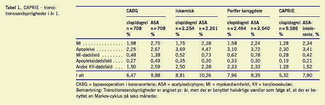 Transitionssandsynlighederne i Tabel 1 beskriver sandsynligheden for, at en patient overføres fra det ene sygdomsstadium til det næste i Figur 1. De oprindelige transitionssan dsynligheder er blevet udledt post hoc fra CAPRIE-databasen. De anslåede transitionssandsynligheder for ASA-intolerante patienter er derimod beregnet på grundlag af en nyligt publiceret metaanalyse, fordi den ikkebehandlede gruppe ikke var med i CAPRIE-studiet [1, 7]. Resultaterne af CAPRIE-studiet viste en årlig risiko for død på 1,1% pga. af ikkevaskulære årsager hos begge grupper. Denne risiko er brugt for alle undergrupper i den anvendte model.