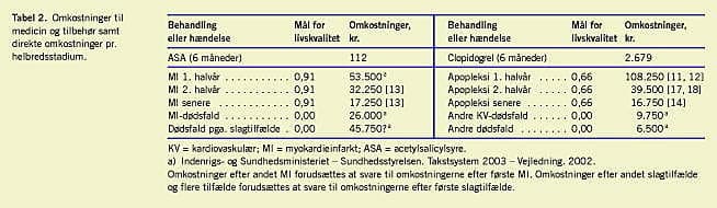 Tabel 2 viser de omkostningsestimater, der er forbundet med det specifikke helbredsstadie over en periode på seks måneder. Omkostningerne i de første seks måneder inkluderer de omkostninger, der er relateret til den akutte sygdomsfase. Omkostningerne er estimeret på baggrund af den medicinske litteratur og diagnoserelateret gruppe (DRG)-takster for 2003. Alle omkostninger er konverteret til det danske prisniveau i 2003 ved hjælp af Danmarks Statistiks forbrugerprisindeks og afrundet til enheder a 250 kr. (www.statistikbanken.dk). Indkøbspriserne for ASA og clopidogrel er angivet uden moms i henhold til Lægemiddelkataloget (www.lmk.dk).