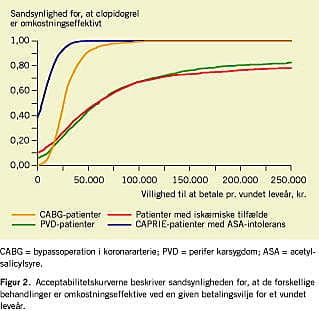Figur 2 illustrerer resultatet af følsomhedssanalysen, idet det er vist, hvor meget usikkerheden om modellens forudsætninger påvirker resultatet. Figur 2 viser fire acceptabilitetskurver. Det kan konkluderes med næsten 100% sikkerhed, at clopidogrelbehandling af ASA-intolerante CAPRIE-patienter er omkostningseffektivt, hvis samfundet er villigt til at betale mere end 40.000 kr. pr. vundet leveår. For CABG-patienter er sandsynligheden for, at behandlingen er omkostningseffektiv 85%, hvis samfundet er villigt til at betale 40.000 kr. eller mere pr. vundet leveår, og næsten 100%, hvis betalingsvilligheden er 80.000 kr. eller højere. For patienter med polyaterosklerotiske karmanifestationer og patienter med iskæmiske tilfælde er der 75% sandsynlighed for, at behandlingen er omkostningseffektiv, hvis betalingsvilligheden er 140.000 kr. eller højere.