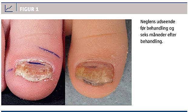 Det primære formål med behandling er, at patienten bliver mykologisk rask, det sekundære at neglen normaliseres. Topikal behandling med f.eks. amorolfin-/ciclopiroxneglelak anses for sufficient i tilfælde med mild distal affektion, mens systemisk peroral behandling er nødvendig i moderate til svære tilfælde, hvor flere negle er inficerede, eller hvor der er affektion af neglematrix [3, 4]. Til peroral behandling af onykomykose hos børn benytter man i flere lande antimykotika såsom terbinafin, itraconazol eller fluconazol [3], men disse er ikke registrerede til behandling af onykomykose hos børn i Danmark. Det er derfor op til den enkelte læge at opveje fordele og ulemper ved behandling. Eksperter er uenige om, hvorvidt det har betydning for behandlingsresponset at vente med behandling, til barnet bliver ældre [1, 5]. Hos barnet i sygehistorien var negleforandringerne progredierende, inddrog flere negle, og mere end halvdelen af første tånegl var angrebet. Vi fulgte anbefalingerne fra en konsensusrapport fra 2005, hvori en kombination af peroral og topikal behandling blev anbefalet [4]. Vi valgte terbinafin, da det er førstevalg til behandling af T. rubrum-infektion hos voksne, og da man har erfaring med dette præparat til behandling af tinea capitis hos børn. Behandlings-