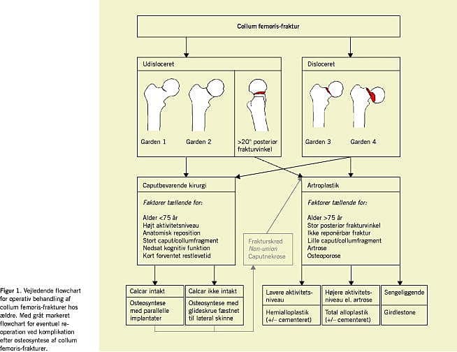 I Referenceprogrammet anbefales intern fiksering ved alle collumfrakturer, fraset hos patienter, der er over 75 år og har en disloceret collumfraktur, hvor der anbefales en hemialloplastik [1]. Gennemgangen af litteraturen gør det muligt at nuancere disse anbefalinger (Figur 1 og Figur 3 ). Således bør en alloplastik tillige overvejes ved den udislocerede fraktur med over 20° posterior frakturvinkling, hvor risikoen for komplikationer efter intern fiksering er øget [13]. For alloplastik taler også tilstedeværelsen af osteoporose eller artrose [1, 27]. For intern fiksation taler derimod anatomisk reposition og et stort caputfragment [26]. Osteosyntese bør også overvejes hos de ældste/demente patienter, som ikke forventes at kunne overholde bevægerestriktionerne ved en hemialloplastik, eller som dårligt tåler den større kirurgiske procedure herved [33]. Om calcar er intakt er dertil essentielt for valg af osteosyntesemetode [18, 27].
