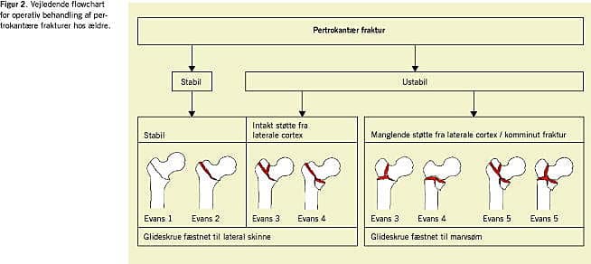 Den pertrokantære fraktur behandles hyppigst med reposition og intern fiksering med en glideskrue og lateral skinne fæstnet med 3-4 skruer i femurskaftet (Figur 2 og Figur 3). AVN ses sjældent. Frakturskred medfører dog reoperation hos 4-12%, afhængigt af frakturtype og operationsmetode [1, 8, 14-17, 35]. Frakturskred skyldes inadækvat reposition og placering af glideskruen, som inden for de første postoperative måneder kan medføre, at caputfragmentet dislocerer i varus, lateraliseres og/eller teleskoperes ned i femurmetafysen med risiko for glideskrueperforation af caput (cut-out ). Dette medfører smerte og forkortet benlængde.