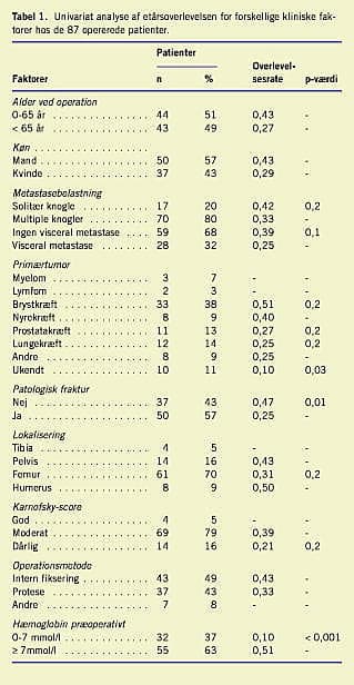 Resultater: Overlevelsesraten var 0,35 efter et år. Ved univariat analyse blev det påvist, at overlevelsen var relateret til køn, knoglelokalisering af metastasen, antal knoglemetastaser, tilstedeværelse af viscerale metastaser, Karnofsky- performance -score, primær kræfttype, tilstedeværelse af patologisk fraktur og præoperativ hæmoglobinværdi. Ved multivariat regressionsanalyse blev det påvist, at patologisk fraktur, hæmoglobinværdi < 7,0 mmol/l og dårlig Karnofsky- performance -score var negative prognostiske faktorer. Brystkræft var den eneste uafhængige positive prognostiske faktor for overlevelse.