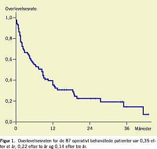 På opgørelsestidspunktet er 65 ud af 87 (75%) patienter døde. Otteoghalvtreds patienter er døde på grund af kræftsygdommen, mens resten døde på grund af anden eller ukendt årsag. 23% af patienterne døde inden for de første seks uger, og 45% inden for de første seks måneder. Etårsoverlevelsesraten for de 87 patienter var 0,35 (Figur 1 ). Alder og køn og operationsmetode var ikke relateret til overlevelse.