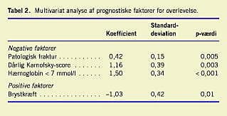 Multivariat regressionsanalysen var baseret på kliniske faktorer, som var prognostiske for etårsoverlevelse ved univariatanalysen. Analysen selekterede patologisk fraktur, præoperativ hæmoglobin værdi < 7 mmol/l og dårlig Karnofsky-score som uafhængige negative prognostiske faktorer for overlevelse. Brystkræft var en positiv prognostisk faktor (Tabel 2 ).