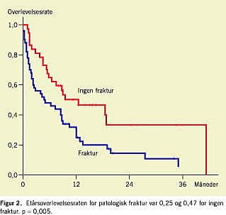 Operation for en patologisk fraktur i femur kan give umiddelbar smertereduktion og bedrer muligheden for patientpleje og gangfunktionen. Patienter opereret for knoglemetastase i bækkenet, næsten altid i acetabularområdet, havde en tendens til bedre overlevelse end patienter opereret for metastaser i femur. Sådanne patienter er selekterede, idet de ikke har et så udtalt behov for operation, som patienter med en patologisk fraktur i femur (Tabel 1).