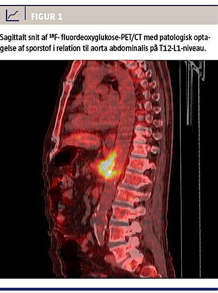 tegn til endokarditis, men 18F-fluordeoxyglukose (18F-FDG)-PET/CT (Figur 1) viste patologisk øget metabolisme i tæt relation til aorta abdominalis, og en CT af abdomen fem dage senere viste udvikling af et mykotisk aortaaneurisme på niveau med afgangen af truncus coeliacus.