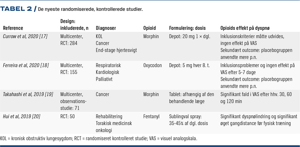 Overordnet anbefalede European Society for Medical Oncology i 2015, at opioid skal være farmakologisk førstevalg ved dyspnø hos patienter med fremskreden kræft, og at hovedparten af den foreliggende litteratur gælder morphin [3]. I Ekström et al’s systematiske review fra 2015 konkluderedes endvidere, at opioider havde dyspnølindrende effekt, men dette var kun undersøgt i små populationer (7-48 patienter) [13]. Et Cochranereview fra 2016 viste svag evidens for effekt af oral eller parenteral opioid mod dyspnø, men fremhævede samtidigt, at studierne var af svingende kvalitet ofte med få inkluderede patienter, og der blev efterlyst større randomiserede kontrollerede studier (RCT) [14]. I 2018 problematiseredes det pågældende Cochranereview, og ved reanalyse af data fandtes en klinisk meningsfuld lindring af dyspnø ved behandling med lavdosisopioid [15]. I oktober 2019 blev et depotmorphin for første gang godkendt til lindring af refraktær dyspnø af de australske myndigheder. Godkendelsen blev baseret på delresultater fra et multicenter-RCT, det såkaldte BEAMS-studie [16]. I resultatet af det færdige multicenterstudie [17] kunne der imidlertid ikke påvises signifikant effekt. Interventionsstudier i de seneste år (2019-2020) lægger sig op ad de tidligere konklusioner med svag evidens for opioiders lindrende effekt ved dyspnø. I studierne har man testet forskellige opioider, oftest morphin, i forskellige formuleringer inden for et bredt udvalg af diagnoser (Tabel 1). Der er en række generelle problemstillinger ved studier med den patientpopulation, der er i palliation. Patienter i sen fase af KOL, hjerteinsufficiens og kræft ønsker ofte ikke at bruge deres sidste tid i forskningsprojekter, så inklusionen kan, for at opnå tilstrækkelig styrke, være langvarig i de større studier. Eksempelvis i Currow et al’s studie [17] hvor de, for at opnå tilstrækkelig styrke, måtte udvide inklusionskriterierne med patienter med lettere dyspnø (Medical Research Council Dyspnea Score (MRC) 2-4 i stedet for MRC 3-4). En anden væsentlig problemstilling var, at adskillige patienter ikke kunne gennemføre studierne pga. tiltagende symptomatologi. Og netop patienternes skrøbelighed kan gøre det udfordrende at opnå godkendelse i de etiske komitéer. F.eks. var det i samme studie et krav fra Etisk Komité, at patienterne havde mulighed for p.n.-behandling. Det viste sig imidlertid, at p.n.-forbruget i kontrolgruppen var signifikant højere og kunne benyttes som udtryk for morphins dyspnølindrende effekt. Også i Ferreira et al’s studie [18] af oxycodon var der inklusionsproblemer og ikke signifikant effekt, men som i Currow et al’s studie fandtes der et signifikant øget p.n.-forbrug i kontrolgruppen. Takahaski et al[19] påviste signifikant effekt af morphin efter 30, 60 og 120 min hos 76% af patienter med kræft, og Hui etal [20]undersøgte fentanyl indtaget i form af sublingval spray før fysisk aktivitet i høj og lav dosering og fandt dyspnølindring og øget gangdistance hos personer, der fik den høje dosis. Der må på nuværende tidspunkt konkluderes, at der fortsat kun er svag evidens for effekt af opioider til refraktær dyspnø og nærværende gennemgang af de nyeste, store interventionsstudier viser, hvilke udfordringer der er for at opnå sikker evidens.