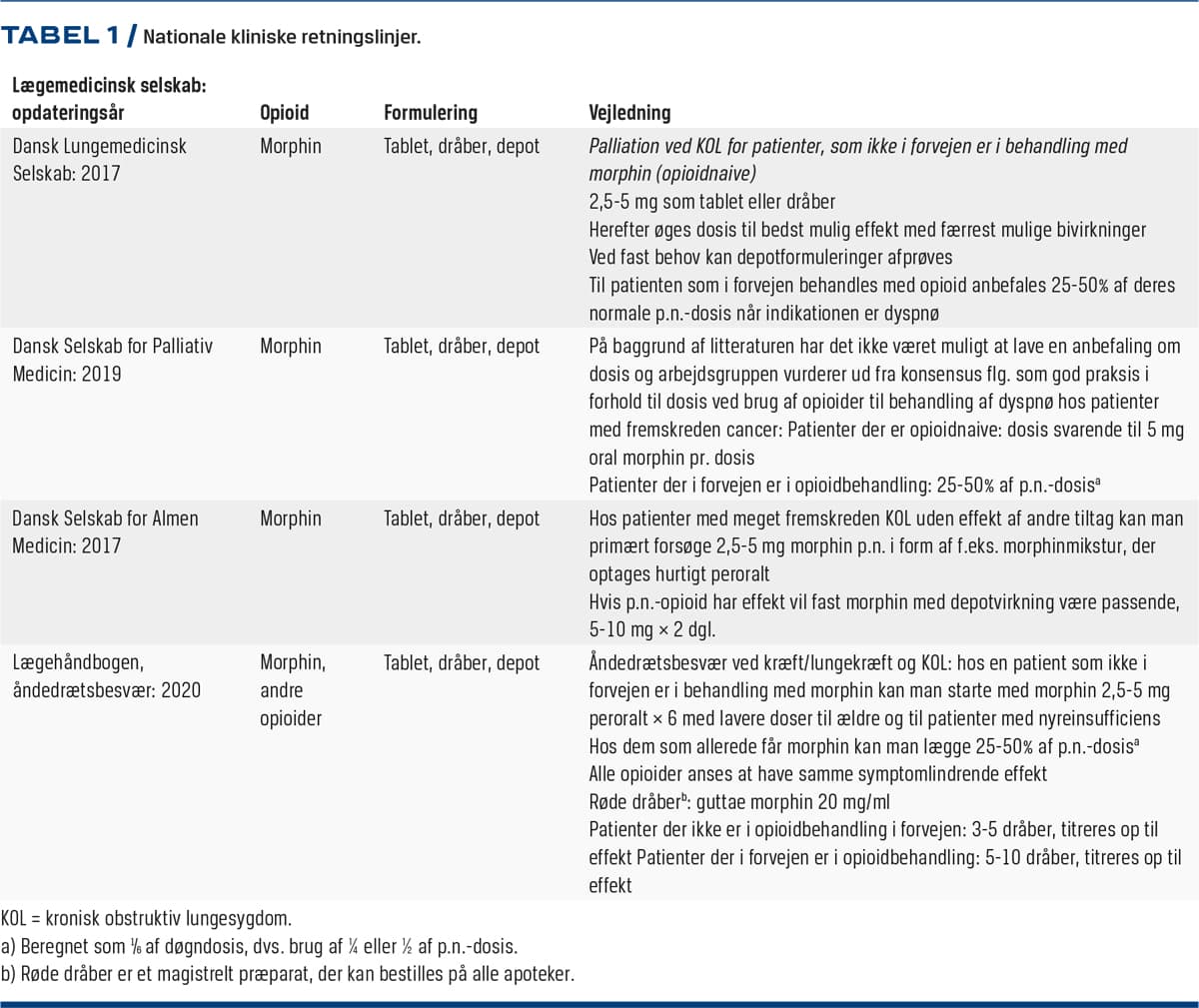 I nationale lungemedicinske og palliative kliniske vejledninger anbefales lavdosisopioid (morphin) til behandling af refraktær dyspnø hos patienter i palliativ fase (Tabel 2). På nuværende tidspunkt er evidensen svag, om end mange studier peger i samme retning. En baggrund for svag evidens kunne være morphins begrænsede biotilgængelighed, hvor andre mere lipofile opioider (specielt fentanyl) muligvis ville give hurtigere lindring. Lavdosisopioid anvendes for øjeblikket off-label mod dyspnø. Det foreslås, at indikationen for opioid, ud over smerter, udvides med lavdosisopioid til behandling af refraktær dyspnø som led i palliativ behandling. Under alle omstændigheder anbefales flere behandlingsforsøg med lavdosisopioid mod refraktær dyspnø hos patienter, som er i palliativ behandling.