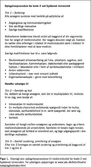 Summary Admission of applicants to medical studies Ugeskr Læger 2004;166:1980-1983 Selection of applicants for medical education in Denmark is based primarily on their grade averages from secondary school (gymnasium). This article describes other means of selection used worldwide and introduces a new concept of selection using interviews, a written essay and an MCQ admission test to evaluate the applicants' informal and personal qualifications. Since 2003, 50% of the student intake at the University of Southern Denmark has been subject to this admission procedure. The results will be evaluated in the years to come.