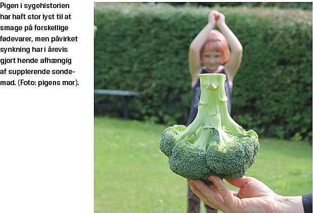 suppleret med indgift af sondemad. PEG-sonden blev forsøgt seponeret uden held, idet hverken sult eller stor madglæde bidrog til bedre synkefunktion. Da hun var i toethalvtårsalderen blev der rejst mistanke om spisevægring, men ved udredning på en børnepsykiatrisk afdeling fandt man god mor-barn-kontakt, stor interesse for mad og for at smage på forskellige madvarer. Typisk blev maden siddende på tungen, og under synkning tog pigen adskillige tilløb, hvor hun aktiverede mimik og halsmuskulatur. Diagnosen OD blev stillet på grund af fortsatte synkemotoriske vanskeligheder, da al somatisk udredning var afsluttet. I treårsalderen havde pigen udviklet sig normalt fin- og grovmotorisk, men hun havde udtalevanskeligheder, begrænset ordforråd og besvær med at blive forstået af de nærmeste familiemedlemmer, hvorfor hun blev henvist til artikulationstræning og sprogstimulation i kommunalt regi. Hun havde ikke kontrol over sin tunges viljestyrede bevægelser. Man fandt udpræget dysdiadokokinese af læber, tunge og den bløde gane. På baggrund af ovenstående blev diagnosen VD stillet da hun var i tre et halvt-årsalderen. Ved sidste kontrol, da hun var knap fem år gammel, var hun forsat afhængig af supplerende PEG-sondeernæring, skønt hun efterhånden kunne indtage en tredjedel af sit fødebehov selv. Hun fik stadig talepædagogisk og synkemotorisk undervisning af en kommunal talepædagog.