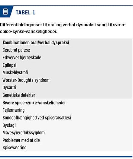 [1, 2]. Der findes ingen opgørelser over forekomsten af OD. Ved vedvarende betydelige motoriske funktionsnedsættelser bør et tværfagligt udredningsforløb igangsættes, idet dyspraksi ikke er noget, man vokser sig fra [1]. Diagnoserne oral og/eller verbal dyspraksi stilles af en speciallæge i pædiatri, eventuelt neuropædiatri, eller af en speciallæge i øre-næse-halssygdomme, eventuelt en foniater. Pigen i sygehistorien var igennem et langvarigt somatisk og psykiatrisk udredningsforløb med relevante betragtninger om differentialdiagnoser, inden dyspraksidiagnoserne kunne fastslås. Korrekt diagnosticering af VD og OD er vigtig, idet udredning, behandling og prognose adskiller sig fra tilsvarende ved andre, mere hyppigt forekommende tale- og spisevanskeligheder (Tabel 1). Både OD og VD kendetegnes ved kliniske fund som f.eks. dysdiadokokinese af læber, tunge og den bløde gane og påvirket automatisering af bevægelser, som indgår i blandt andet synkning og tale. Tidlig intervention med struktureret, intensiv motorisk træning anbefales for at give barnet de bedste udviklingsbetingelser og opnå et normalt funktionsniveau [2, 5]. Behandlingen af OD bør udføres af oralmotorisk kyndige fysio- eller ergoterapeuter, hvorimod behandling af VD er en talepædagogisk specialistopgave.