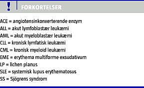 Lichen planus (LP) er en inflammatorisk hud- og slimhindesygdom, hvis ætiologi er ukendt, og som oftest optræder i 30-60-årsalderen. På huden ses kløende, tætstillede, ca. fem millimeter store, blåligt-røde papler, der typisk er lokaliseret på underarmenes volarsider, crura og sakralregionen. I mundslimhinden ses ofte symmetrisk netagtig stregtegning, især på kinder, tunge, gane og gingiva. Oral LP kan præsentere sig som en retikulær, erytematøs, ulcerøs, bulløs, plaklignende eller papuløs type. Flere typer kan optræde samtidigt. Adskillige lægemidler herunder angiotensinkonverterende enzym (ACE)-hæmmere, betablokkere, nonsteroide antiinflammatoriske stoffer, diuretika og hydroxyklorokin kan udløse likenoide reaktioner, der klinisk og histologisk kan være vanskelige at adskille fra LP [4, 15].