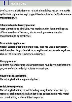 En lang række systemiske sygdomme afficerer mundhulen og kan ytre sig ved forandringer i mundslimhinderne, det hårde tandvæv og/eller give symptomer som mundtørhed og smerte. I denne artikel fremhæves systemiske sygdomme, som hyppigt er forbundet med orale manifestationer og symptomer.