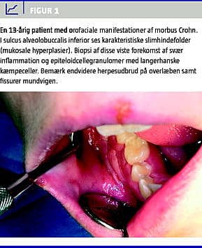 Morbus Crohn er en kronisk inflammatorisk tarmsygdom, som fortrinsvis er lokaliseret til ileocækalregionen. Ætiologien er ukendt. De almene manifestationer omfatter træthed, vægttab, mavesmerter, feber, diarre, iridocyclitis/episcleritis, artralgier og erythema nodosum. Orofaciale manifestationer ses hos 5-15% af patienterne i form af diffuse hævelser af læber, gingiva og kindslimhinde, fortykkelser i kindslimhinden, recidiverende aftøs stomatitis, mukosale hyperplasier i kindens omslagsfold, gingivitis og angulær cheilitis (Figur 1 ).