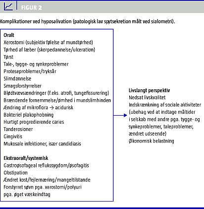 Sjögrens syndrom (SS) er en kronisk autoimmun bindevævssygdom af ukendt ætiologi, som rammer især kvinder i 40-50-årsalderen. SS er karakteriseret ved lymfocytær infiltration af de eksokrine kirtler, især tåre- og spytkirtler. De hyppigste manifestationer er keratoconjunctivitis sicca og hyposalivation, der resulterer i øjen- og mundtørhed, og herudover myoartralgier, træthed, feber, perifer neuropati, vaskulitis og Raynauds fænomen. SS kan optræde som en selvstændig sygdom (primært SS), eller sekundært til andre inflammatoriske gigtsygdomme, hovedsageligt til reumatoid artritis (sekundært SS). De orale manifestationer er associeret til den reducerede spytsekretion, som imidlertid ikke er specifikke for SS, men kan ses ved hyposalivation af anden ætiologi (Figur 2 ). Omkring 35% af patienterne har intermitterende hævelser af glandulae parotideae eller submandibularis. Patienter med SS har en øget risiko for udvikling af malignt NHL [3, 4, 12].