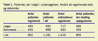 I studieperioden fik 1.391 patienter i de deltagende praksis ordineret medicin, heraf 493 (35%) via en læge og 898 (65%) via en sekretær. Der blev registreret data for 952 patienter (Tabel 1 ). Der blev i gennemsnit ordineret 1,5 lægemiddel pr. patient til disse patienter (Tabel 2 ). Herudfra estimeredes det, at der blev foretaget 2.087 ordinationer til de 1.391 patienter. Med ovennævnte fordeling af ordinationerne på læger og sekretærer samt en andel af fornyelser på 62% hos en læge og 93% hos en sekretær (Tabel 2) estimeredes fornyelsernes andel af det samlede antal ordinationer til at udgøre 82%. De 2.087 ordinationer var fordelt på 14 praksis og fem dage, svarende til 30 pr. dag pr. praksis. I alt 805 patienter modtog et spørgeskema, heraf 346 ved en konsultation hos lægen og 459 pr. brev efter telefonisk kontakt med en sekretær. I alt 584 patienter (73%) udfyldte og returnerede spørgeskemaet, heraf 268 (77%) efter kontakt med en læge og 316 (69%) efter kontakt med en sekretær.