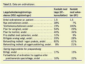 65% af alle ordinationer foregik telefonisk via sekretæren. Det drejede sig primært om receptfornyelser, men 7% af sekretærernes recepter var nyordinationer, der således skete uden direkte kontakt mellem patienten og lægen. 21% af de ordinationer, der blev foretaget via en sekretær, var indledt i sygehusregi, hvilket er i overensstemmelse med fund i et engelsk studie (22%) [3].