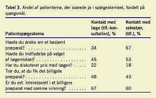 45% af de patienter, der havde kontakt med lægen mente, at de havde indflydelse på valg af præparat, og 22% havde drøftet prisen med lægen. 67% var interesserede i at få ordineret et billigere præparat med samme virkning som det ordinerede (Tabel 3 ).