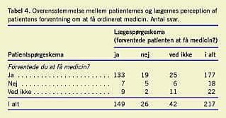 I alt 177 af 217 (81%) patienter forventede forud for konsultationen hos lægen at få ordineret medicin. For 68 (31%) patienter afveg lægens opfattelse af patientens forventning om ordination fra patientens faktiske forventning, eller lægen var usikker på patienternes forventninger (Tabel 4 ). Patienter og sekretærer var i 114 ud af 293 tilfælde (39%) uenige om, hvorvidt der var aftalt kontrol, og om, hvorvidt der var lagt en plan for varighed af behandlingen. Patienterne angav hyppigere end sekretærerne (40% mod 28%), at der forelå en plan.