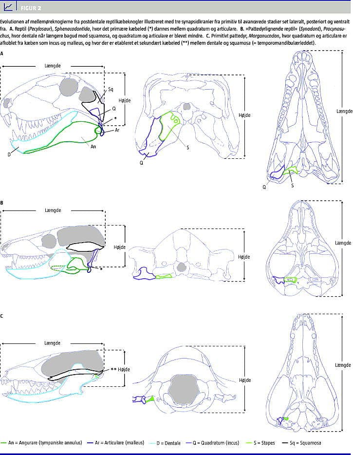 Oprindelsen til malleus og incus findes i reptilkæben, der omfatter den tandbærende dentale, angulare bag dentale og articulare bag denne. Articulare artikulerer med quadratum ovenover og danner hos reptiler det »primære kæbeled« (Figur 1 ) [1, 5, 14, 16]. Hos transitionelle former ses en gradvis reduktion af quadratum og articulare og en vækst af dentale, der efterhånden bliver en enkel kæbeknogle - pattedyrs mandibula - som efterhånden får kontakt med squamosa anteriort for quadratum i overkæben [5, 14, 16, 17]. Kæbeleddet hos pattedyr dannes mellem os temporale og mandibula, det »sekundære kæbeled«. Hvad end årsagen var, blev de »postdentale« knogler aflastet fra deres rolle i tygning; de var allerede i en vis grad involveret i hørelse, eftersom vibrationer tidligere i evolutionen var blevet transmitteret via disse knogler til hyomandibula [14].