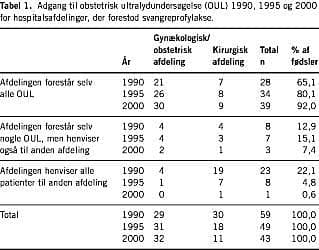 Materiale og metoder: Der blev foretaget en enqueteundersøgelse i foråret 2000 med svar fra alle danske hospitalsafdelinger, der forestod svangreprofylaktiske undersøgelser og/eller udførte obstetriske UL-undersøgelser (OUL), i alt 47 afdelinger. Den samlede besvarelsesprocent var 100.