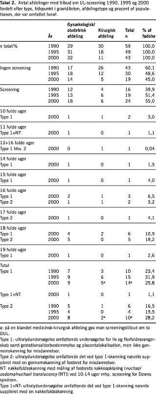 Som det fremgår af Tabel 2 , fik 55% af landets gravide på i alt 24 afdelinger et tilbud om UL-screening. For 28,2% af de gravide var screeningstilbudet af type 2, altså omfattende en misdannelsesscreening af fosteret. 25,8% af de gravide fik et tilbud af type 1, mens de gravide på en afdeling med i alt 1,1% af de gravide fik tilbud om type 1-skanning og nakkefoldsskanning (type 1 + NT). Tre specialafdelinger, som tidligere gav tilbud om UL-screening, var ophørt hermed pr. 1. januar 2000 og havde påbegyndt (to afdelinger) eller skulle til at begynde på (en afdeling) et medicinsk teknologivurderingsprojekt (MTV-projekt) omhandlende obstetrisk UL-screening. Disse afdelinger varetog svangreprofylakse for 14,2% af landets gravide. Atten af i alt 32 specialafdelinger (56,3%) samt seks af 11 kirurgiske fødeafdelinger (54,5%) gav tilbud om UL-screening. En blandet medicinsk-kirurgisk afdeling med 0,04% af landets fødsler gav tilbud om to screeningsundersøgelser i graviditeten, i fulde uger 12 og 16. Alle øvrige afdelinger med screeningstilbud havde et tilbud, som lå i intervallet 10-19 fulde gestationsuger.