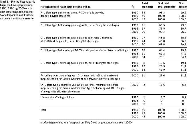 Selv om afdelingernes screeningskapacitet generelt har været stigende gennem tiårsperioden, ses det tydeligt af Tabel 3, at der på undersøgelsestidspunktet kun var kapacitet til landsdækkende type 1-screening, men ikke kapacitet til, at alle gravide i landet kunne få et tilbud om gennemskanning af fosteret og slet ikke kapacitet til landsdækkende NT-screening. Kun 11 afdelinger, der varetog svangreprofylakse for 31,5%, svarede, at de mente at have kapacitet inkl. kvalificeret personale til at give alle gravide på deres respektive afdelinger et sådan tilbud. En væsentlig forklaring herpå er uden tvivl, at mange afdelinger realistisk har konstateret, at deres personale endnu ikke var uddannet i at foretage nakkefoldsskanning. Dette ses bl.a. af, at langt flere afdelinger (n=18) havde svaret, at de havde kapacitet til at tilbyde alle gravide en type 2-skanning (inkl. misdannelsesskanning). Apparatur, tid og personaleresurser til at udføre de to typer skanninger er stort set den samme - men nakkefoldsskanning er en ny screeningsmetode, som kræver oplæring.