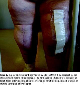 Indførelsen af antibiotika- og tromboseprofylakse ved ortopædkirurgi har mindsket hyppigheden hos overvægtige af alvorlige perioperative komplikationer til alloplastikbehandling. Langtidsresultaterne af alloplastikbehandling af disse patienter er dog generelt ringere end hos normalvægtige (Figur 1, Figur 2 , Figur 3 og Figur 4 ). Englund konstaterede hos meniskektomerede patienter med BMI > 30 kg/m2 en større hyppighed af knæ-OA end hos normalvægtige (BMI < 25 kg/m2 ) [16].